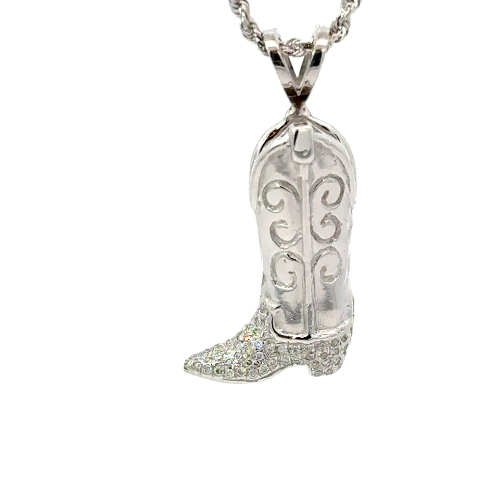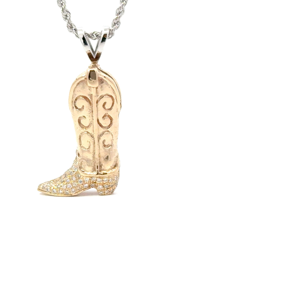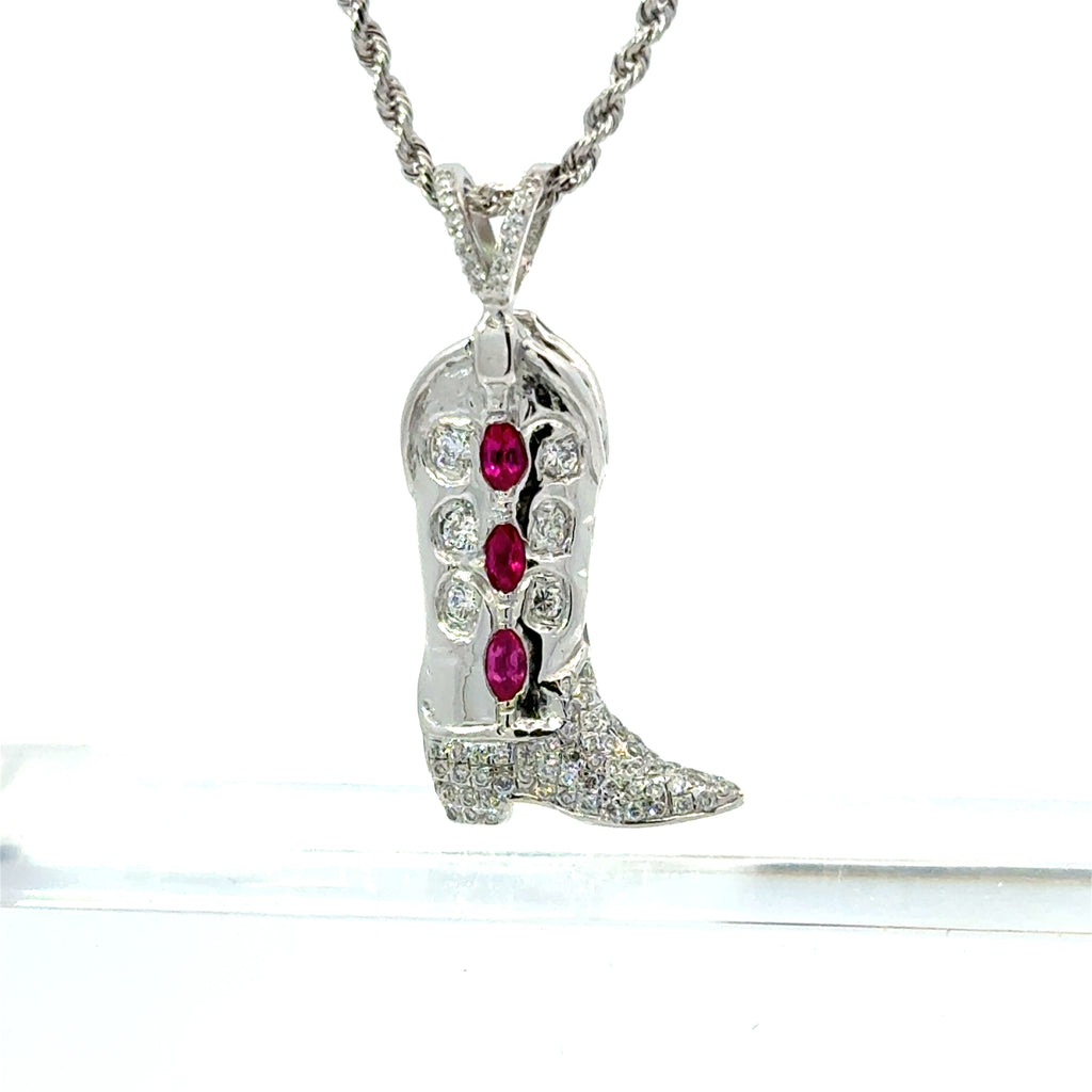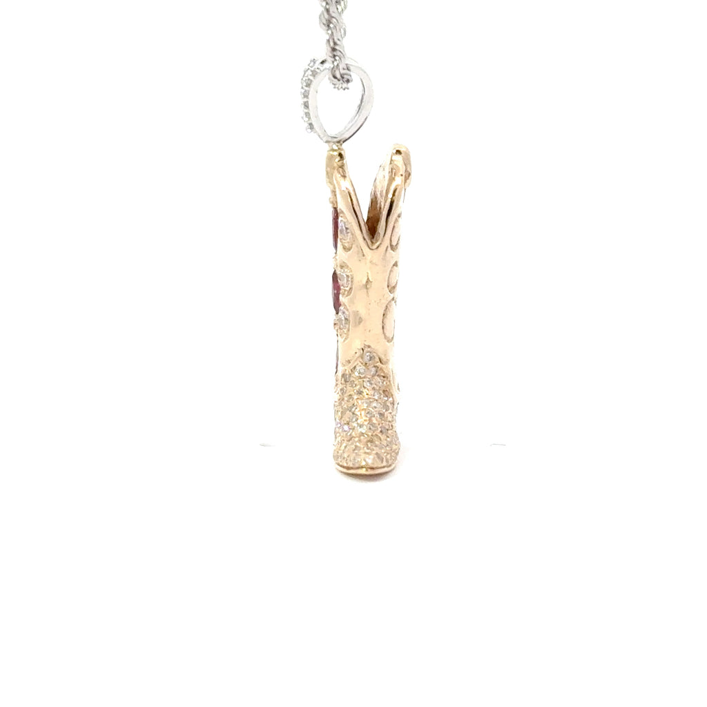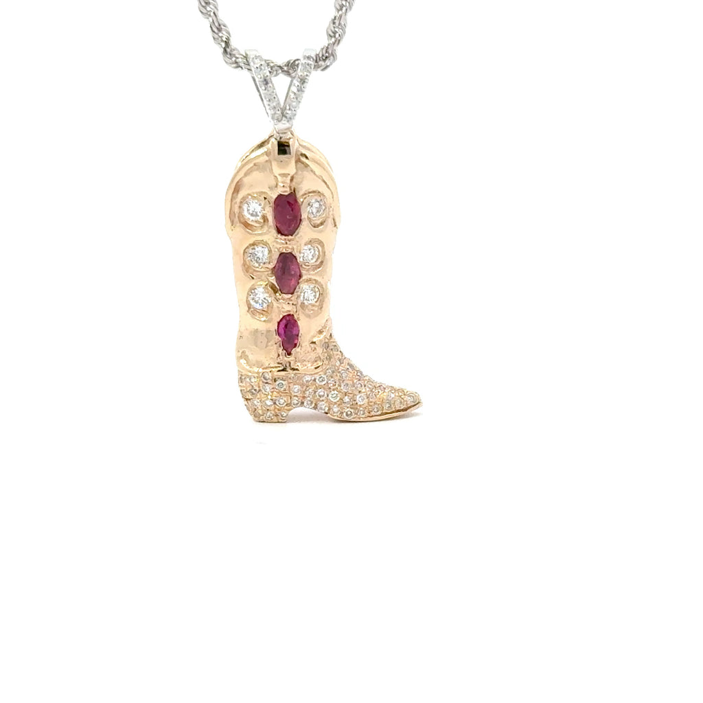 Western boot pendant with a total of  1 carat natural diamonds and 1/4 carat of rubies. Set in solid 14k gold.
